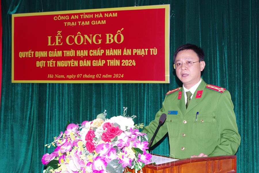 Ngày 07/2, Trại tạm giam, Công an tỉnh Hà Nam tổ chức lễ công bố Quyết định giảm thời hạn chấp hành án phạt tù cho 32 phạm nhân trong dịp Tết Nguyên đán Giáp Thìn 2024. Đại tá Phạm Hùng Dương - Phó Giám đốc, Thủ trưởng Cơ quan thi hành án hình sự, Công an tỉnh dự, chỉ đạo lễ công bố.