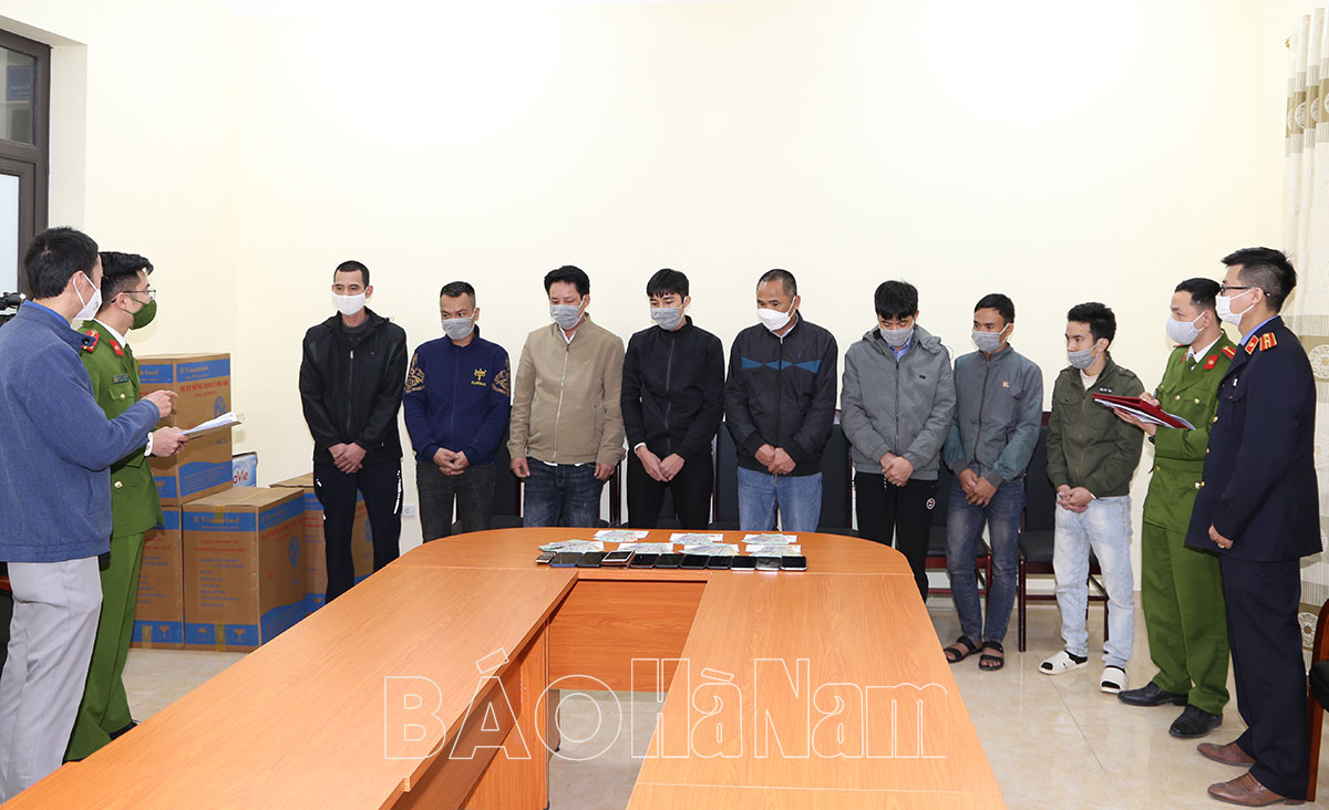 Ngày 18/1, Công an thị xã Duy Tiên (Hà Nam) cho biết đang tạm giữ 08 đối tượng gồm: Nghiêm Tiền Phong, Đinh Văn Vương, Nghiêm Văn Trung, Phạm Khải An, Trần Huy Thông, Nghiêm Văn Lập, Vũ Hồng Khôi và Nguyễn Văn Tường cùng trú ở phường Châu Giang, thị xã Duy Tiên để điều tra về hành vi đánh bạc.