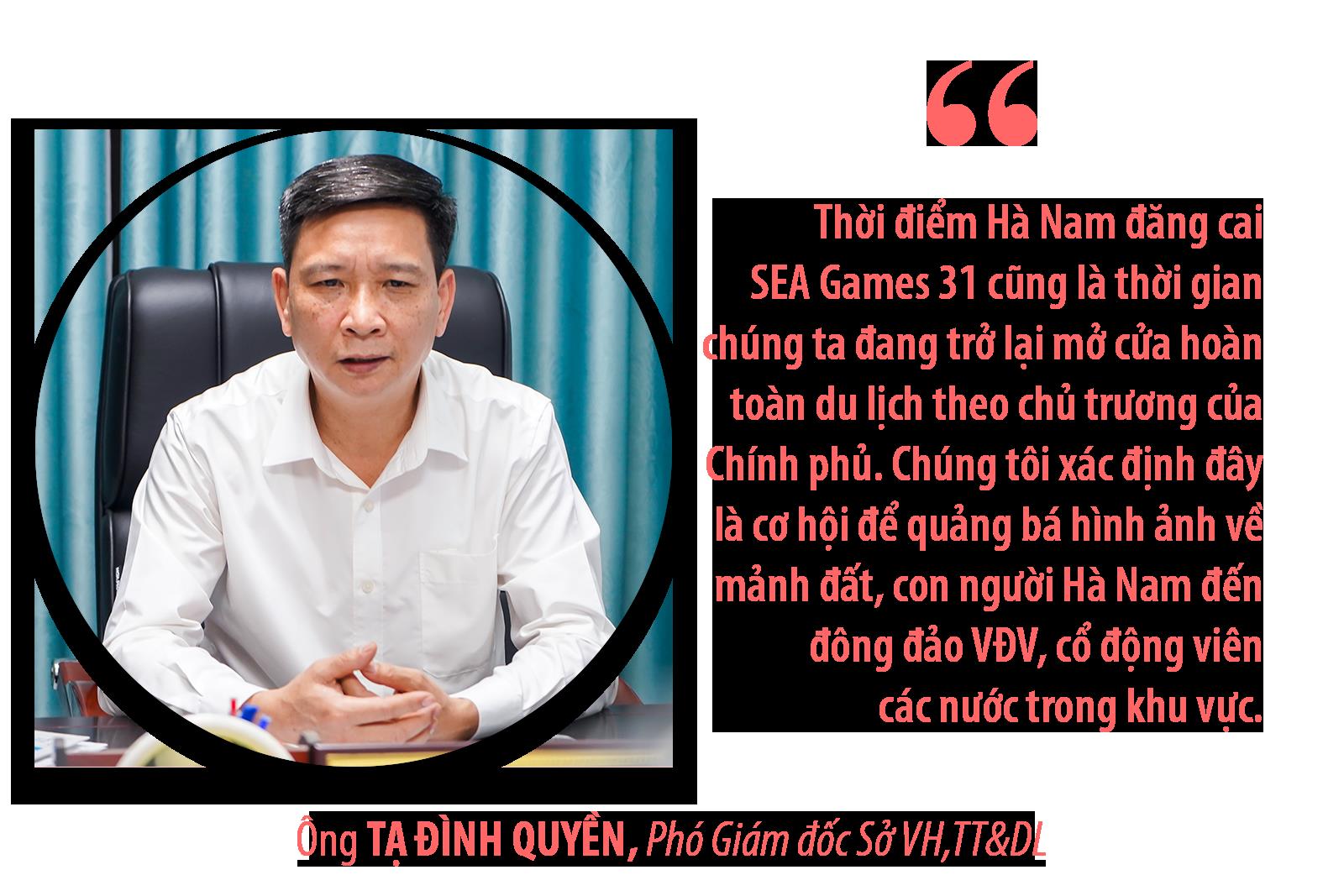 Ông Tạ Đình Quyền: Thời điểm Hà Nam đăng cai SEA Games 31 cũng là thời gian chúng ta đang trở lại mở cửa hoàn toàn du lịch theo chủ trương của Chính phủ. Chúng tôi xác định đây là cơ hội để quảng bá hình ảnh về mảnh đất, con người Hà Nam đến đông đảo VĐV, cổ động viên các nước trong khu vực.