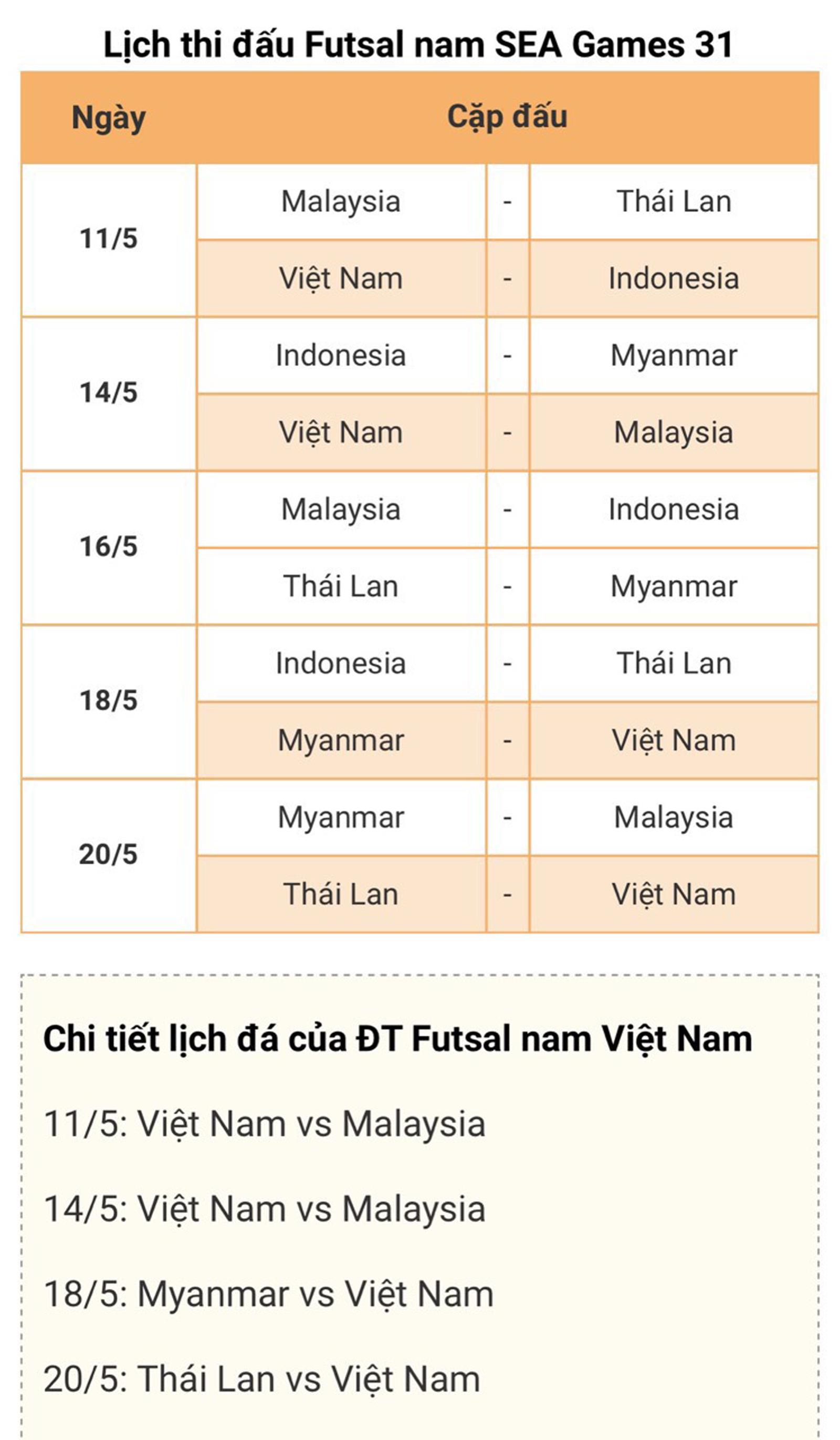 Lịch thi đấu môn Futsal nam, nữ SEA Games 31 tại Hà Nam: