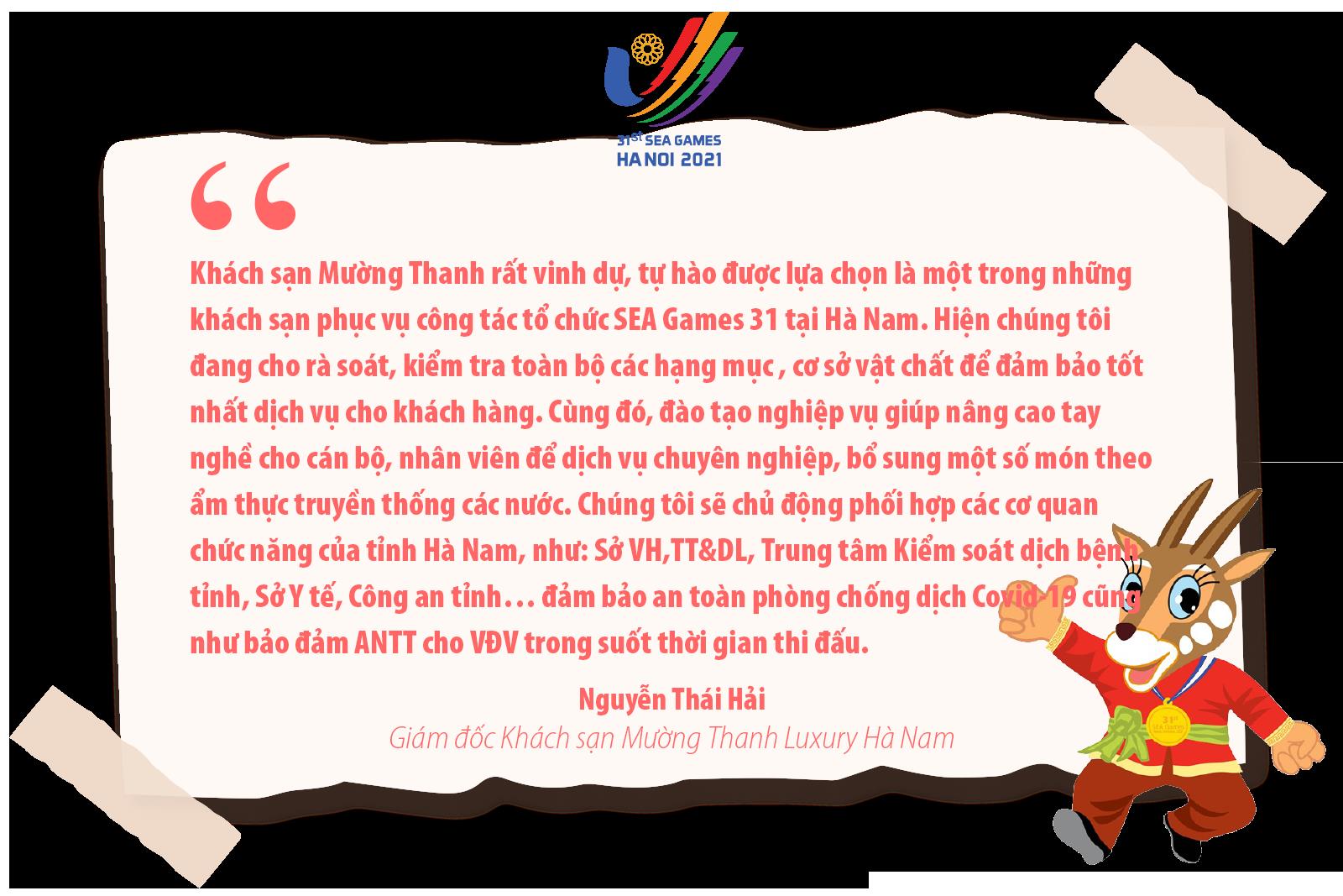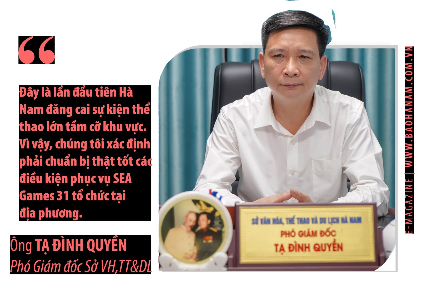 SEA Games 31 sắp diễn ra tại Hà Nội và 11 tỉnh, thành lân cận. Hà Nam vinh dự được lựa chọn đăng cai tổ chức thi đấu môn Futsal ở cả 2 nội dung nam và nữ. Bảo đảm hoàn thành tốt nhiệm vụ được giao, thời gian qua, Sở Văn hóa, Thể thao và Du lịch (VH, TT&DL) đã tích cực chuẩn bị với mong muốn qua giải đấu này tạo ấn tượng mạnh mẽ trong công tác tổ chức giải; tiếp tục quảng bá hình ảnh về mảnh đất, con người Hà Nam đến đông đảo du khách trong và ngoài nước. “Chúng tôi xác định, phải chuẩn bị thật tốt các điều kiện phục vụ Sea Games 31 tổ chức tại địa phương”. Ông Tạ Đình Quyền , Phó Giám đốc Sở VH,TT&DL, Phó Trưởng ban tổ chức SEA Games 31 địa phương chia sẻ.