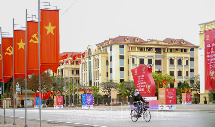 Các tuyến đường tại thành phố Phủ Lý, trung tâm tỉnh đã được trang trí nhiều cờ và pano tuyên truyền cho SEA Games 31