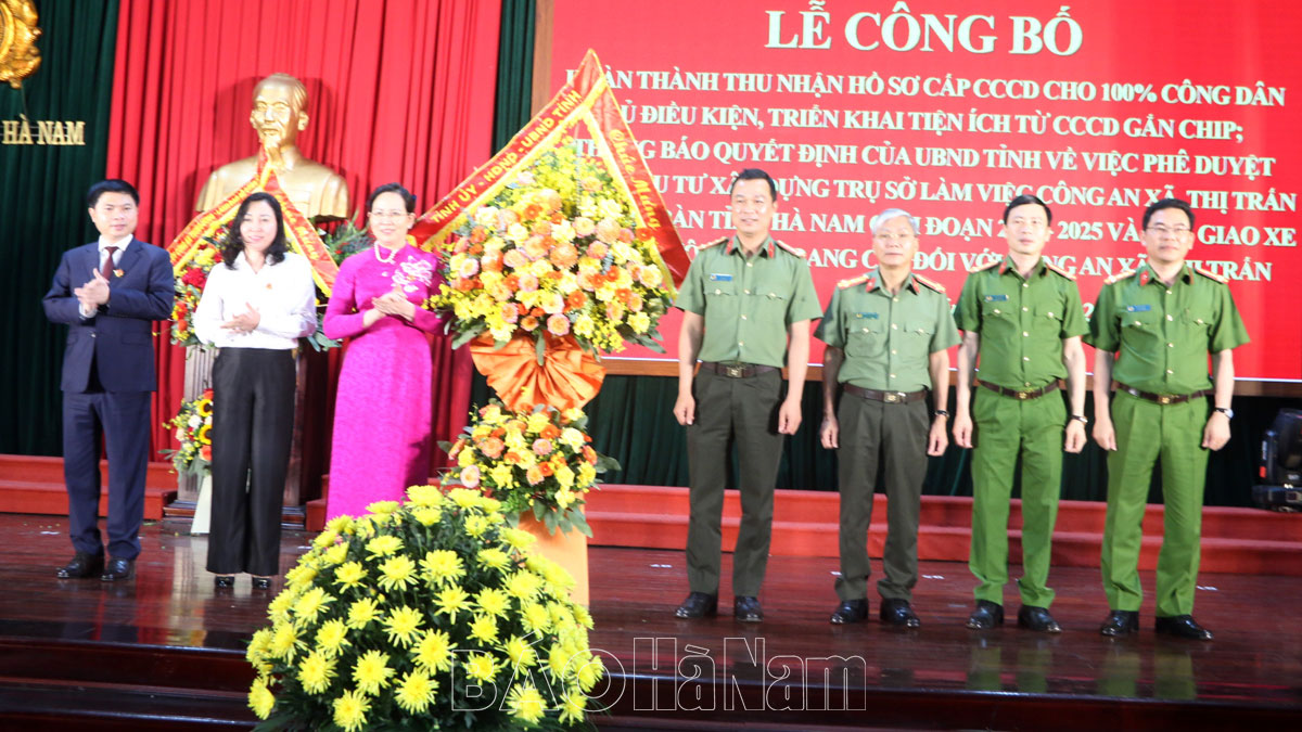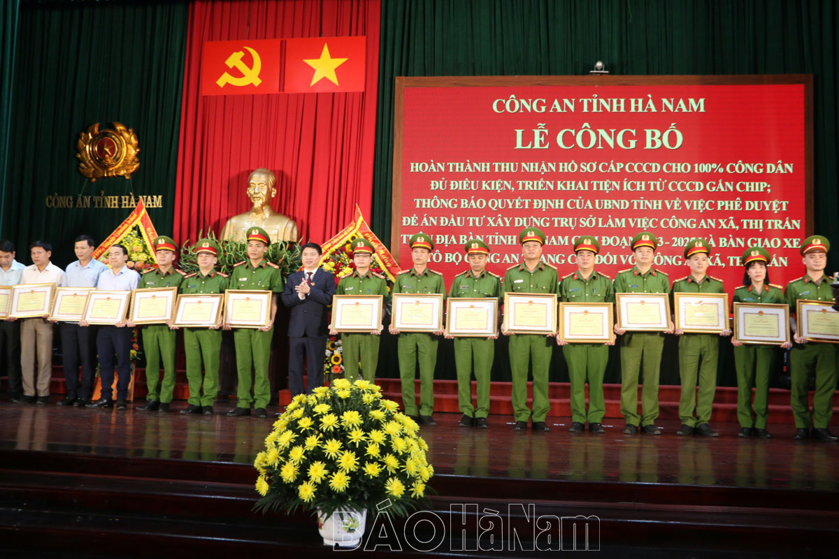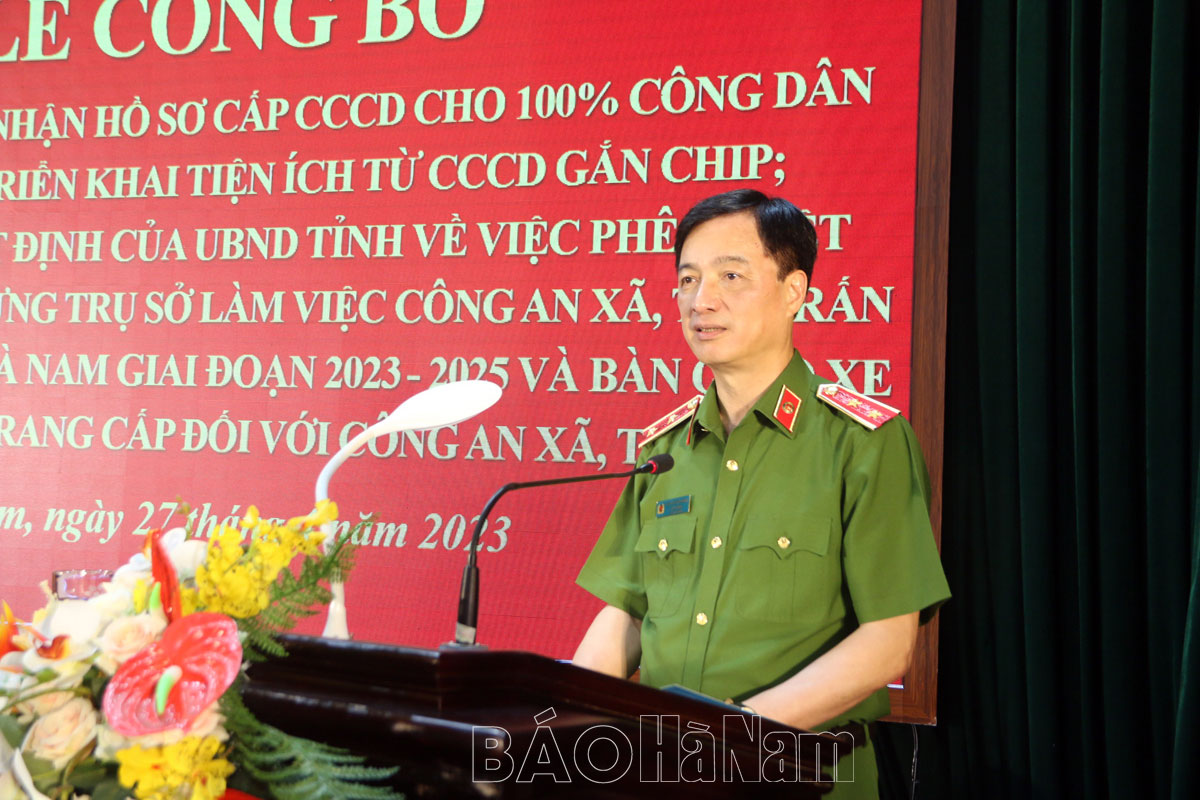 Chiều 27/4, Công an tỉnh Hà Nam tổ chức Lễ công bố hoàn thành thu nhận hồ sơ cấp Căn cước công dân (CCCD) cho 100% công dân đủ điều kiện, triển khai các tiện ích từ CCCD gắn chíp; thông báo Quyết định của UBND tỉnh phê duyệt đầu tư xây dựng trụ sở làm việc Công an xã, thị trấn trên địa bàn tỉnh Hà Nam giai đoạn 2023 - 2025 và bàn giao xe ô tô của Bộ Công an trang cấp đối với Công an xã, thị trấn.
