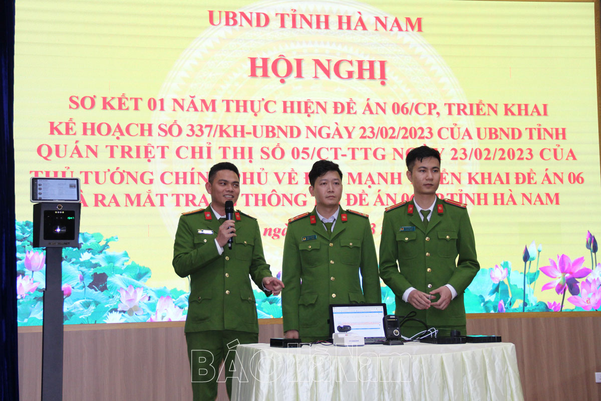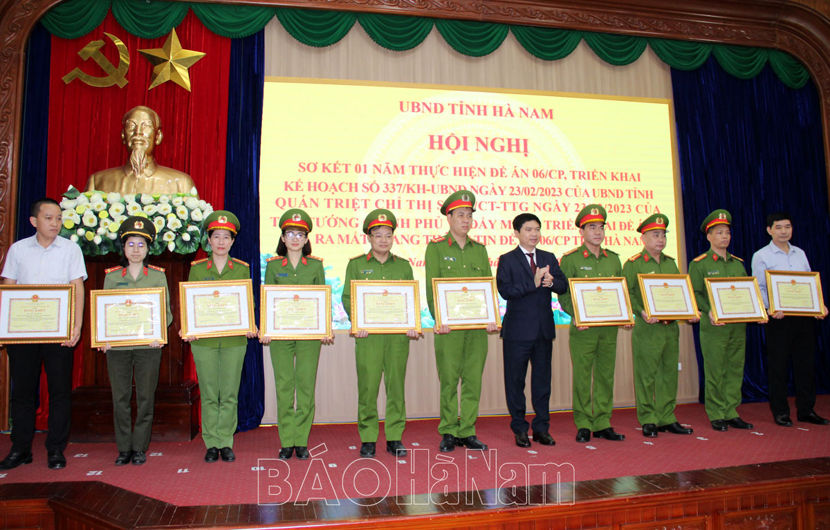Nhân dịp này, Đại diện Cục C06, Bộ Công an giới thiệu các tính năng của máy đọc mã QR trên CCCD và ứng dụng VNeID; UBND tỉnh đã ra mắt trang thông tin Đề án 06 tỉnh Hà Nam (https://dean06.hanam.gov.vn) và trao tặng Bằng khen cho 5 tập thể, 5 cá nhân có thành tích xuất sắc trong triển khai thực hiện Đề án 06 trên địa bàn tỉnh.