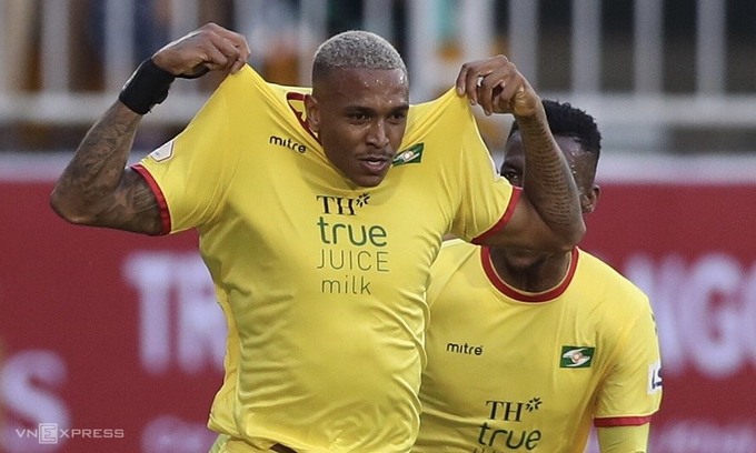 Felipe (trái) mừng bàn thắng vào lưới đội bóng cũ HAGL.