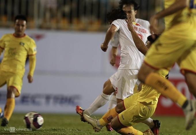 Khi HAGL đẩy cao tốc độ tấn công, SLNA dần lộ điểm yếu. Phút 35, đội khách chỉ còn chơi với 10 người, khi trung vệ Thái Ba Sang nhận thẻ vàng thứ hai, đồng nghĩa thẻ đỏ. Từ đường chuyền vượt tuyến của Hồng Duy từ sân nhà, Văn Toàn bứt xuống và bị Bá Sang truy cản trái luật. Đội khách phản ứng quyết liệt nhưng không thay đổi được quyết định của trọng tài Ngô Duy Lân.