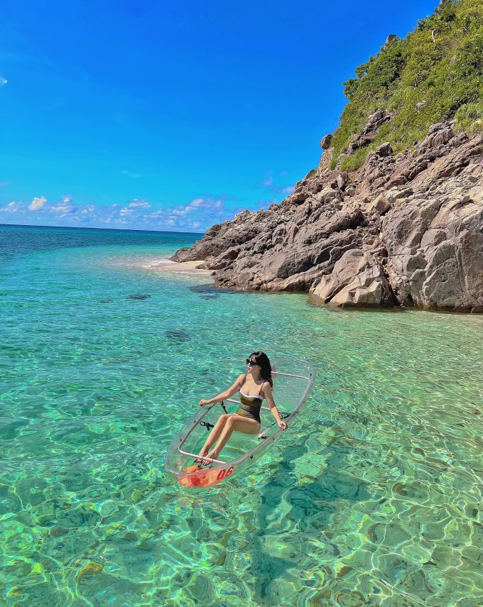 Nước trong vắt ở Hòn Trác kết hợp với kayak trong suốt khiến du khách như đang lơ lửng trên biển. Ảnh: Ngoc Ha Chu