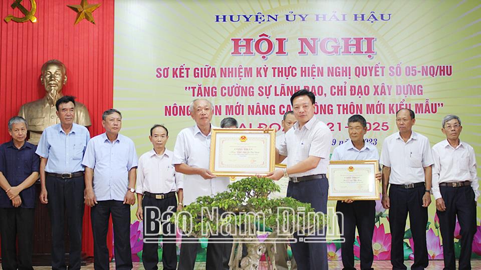 | Lãnh đạo UBND huyện Hải Hậu trao bằng công nhận cho đại diện các xóm đạt chuẩn NTM kiểu mẫu. |