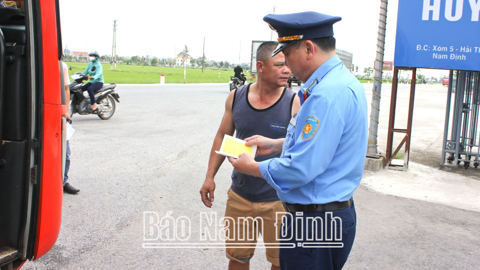 | Lực lượng chức năng kiểm tra việc chấp hành quy định của pháp luật về vận tải hành khách bằng xe ô tô tại Bến xe khách huyện Hải Hậu. |