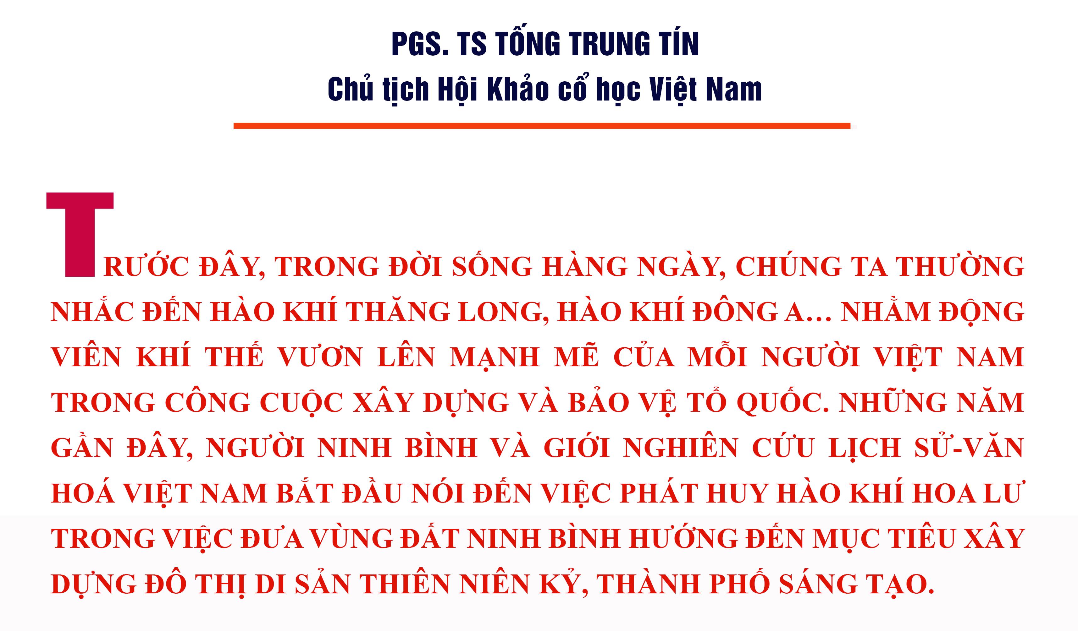 | Có thể nói, nền văn hoá Đại Cồ Việt Đại Việt với Di sản Hoa Lư đã tạo tiền đề và mở đường cho sự phát triển đến đỉnh cao của văn hoá, văn minh Việt Nam trong các thời kỳ tiếp theo. Đó là Hào khí Hoa Lư, đặc sản văn hoá Việt Nam thế kỷ X. Thật là hiếm quý với một vùng đất thiêng, với tất cả nhiệt huyết cháy bỏng của người dân Ninh Bình hôm nay đã và đang thể hiện ý chí quyết tâm mang Hào khí Hoa Lư hướng tới một Đô thị di sản thiên niên kỷ, thành phố sáng tạo. Đó là một ý chí sáng tạo, kết hợp nhuần nhuyễn giữa truyền thống và hiện đại, giữa khát vọng và niềm tin, thể hiện quyết tâm vươn lên mạnh mẽ, tràn đầy trí tuệ của Ninh Bình xưa và nay, để vững bước tiến lên một cách toàn diện, phồn vinh. |