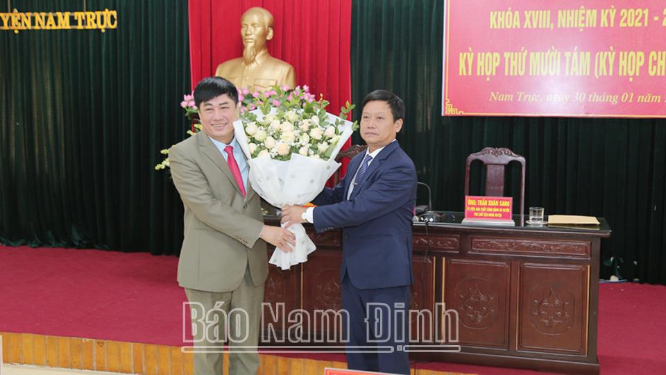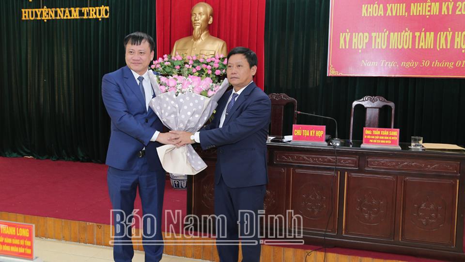 | Đồng chí Mai Thanh Long, TUV, Phó Chủ tịch HĐND tỉnh tặng hoa chúc mừng đồng chí Lưu Quang Tuyển, Bí thư Huyện ủy trúng cử chức danh Chủ tịch HĐND huyện Nam Trực khóa XVIII, nhiệm kỳ 2021-2026. |