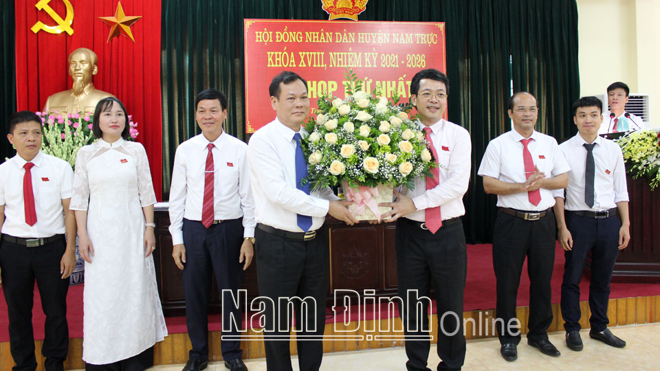 | Đồng chí Lê Quốc Chỉnh, Phó Bí thư Thường trực Tỉnh uỷ, Chủ tịch HĐND tỉnh tặng hoa chúc mừng các đồng chí Thường trực HĐND huyện Nam Trực khoá XVIII, nhiệm kỳ 2021-2026. |