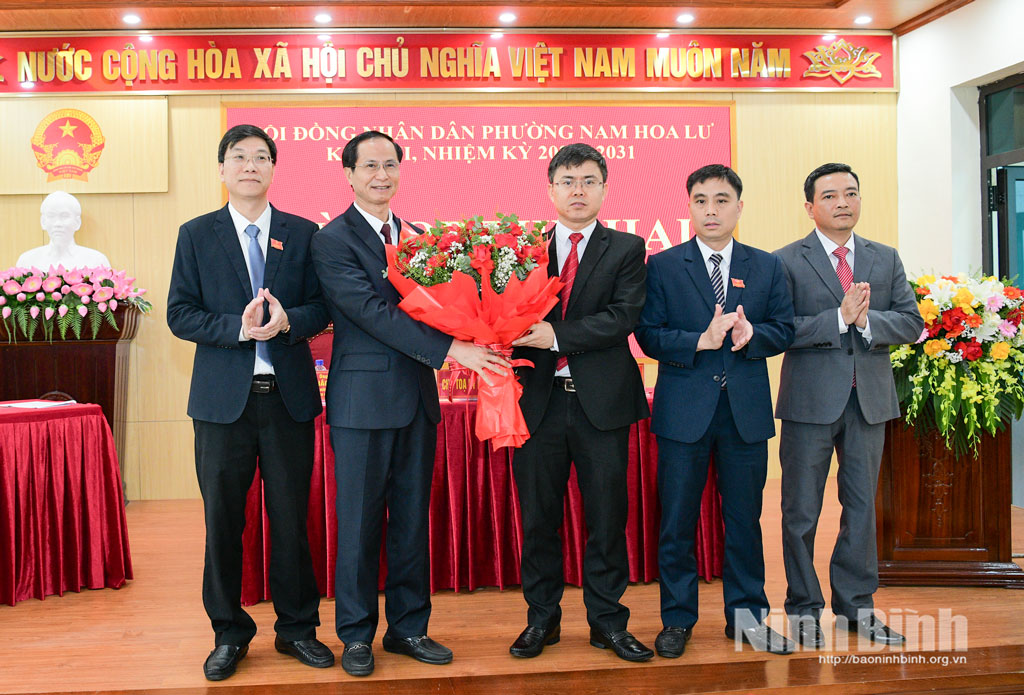 Lãnh đạo HĐND phường tặng hoa chúc mừng đồng chí Vũ Bá Hoàng được bầu giữ chức danh Phó Chủ tịch UBND phường.