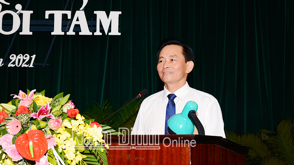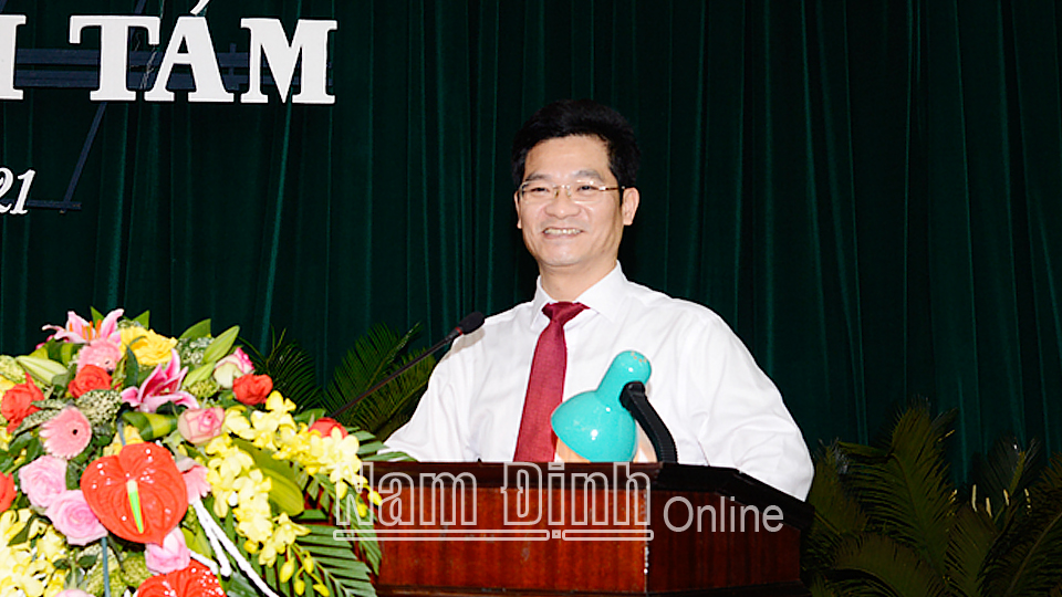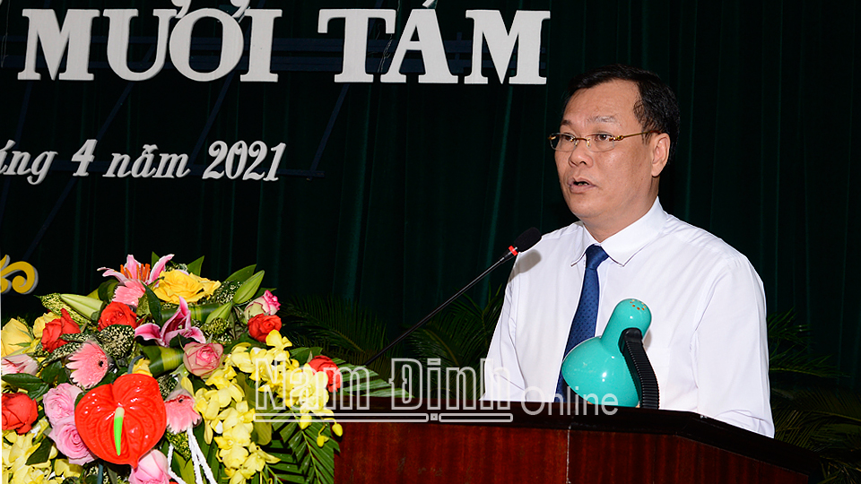 Đồng chí Trần Anh Dũng, Uỷ viên Ban TVTU, Phó Chủ tịch Thường trực UBND tỉnh trình bày báo cáo tổng kết công tác nhiệm kỳ 2016-2021 của UBND tỉnh khẳng định: Nhiệm kỳ 2016-2021, UBND tỉnh, Chủ tịch UBND tỉnh đã không ngừng đổi mới phương pháp lãnh đạo, điều hành theo hướng sâu sát, quyết liệt, rõ trách nhiệm; đề cao nguyên tắc tập trung dân chủ; nâng cao trách nhiệm cá nhân của Chủ tịch, các Phó Chủ tịch UBND tỉnh và từng thành viên UBND tỉnh; tập trung giải quyết những vấn đề lớn, vấn đề khó, những vấn đề trọng điểm có tính quyết định đến sự phát triển của tỉnh trước mắt cũng như lâu dài. Đặc biệt, UBND tỉnh đã tranh thủ sự lãnh đạo của Trung ương, của Tỉnh ủy, sự giám sát chặt chẽ của HĐND tỉnh, sự phối hợp thường xuyên tích cực của MTTQ và các đoàn thể, cùng sự nỗ lực, phấn đấu của nhân dân và cộng đồng doanh nghiệp; qua đó góp phần quan trọng hoàn thành thắng lợi, toàn diện các nhiệm vụ của nhiệm kỳ với nhiều kết quả nổi bật. Tất cả các chỉ tiêu kinh tế đều đạt và vượt kế hoạch đề ra, trong đó một số chỉ tiêu đạt cao nhất từ trước đến nay như: Thu ngân sách nhà nước năm 2020 đạt trên 6.000 tỷ đồng; giá trị hàng hóa xuất khẩu đạt 2,2 tỷ USD; chương trình xây dựng nông thôn mới hoàn thành trước 1,5 năm, Nam Định là một trong hai tỉnh đầu tiên của cả nước hoàn thành nhiệm vụ xây dựng nông thôn mới; hệ thống kết cấu hạ tầng kinh tế - xã hội được quan tâm đầu tư và tập trung chỉ đạo, đôn đốc thực hiện, nhiều công trình, dự án quan trọng đã hoàn thành và đang triển khai khi hoàn thành sẽ tạo diện mạo mới, động lực cho phát triển kinh tế - xã hội trong giai đoạn tới; công tác cải cách hành chính, xây dựng chính quyền điện tử đạt được kết quả tích cực; tổ chức bộ máy được sắp xếp từng bước tinh gọn, hoạt động hiệu lực, hiệu quả; các lĩnh vực văn hóa - xã hội có nhiều thành tích mới, ngành giáo dục và đào tạo luôn duy trì thành tích trong tốp dẫn đầu cả nước; tập trung thực hiện quyết liệt, hiệu quả các biện pháp phòng, chống dịch COVID-19; đời sống vật chất, tinh thần của nhân dân được cải thiện rõ rệt; quốc phòng, quân sự địa phương được củng cố, an ninh chính trị, trật tự an toàn xã hội được giữ vững...