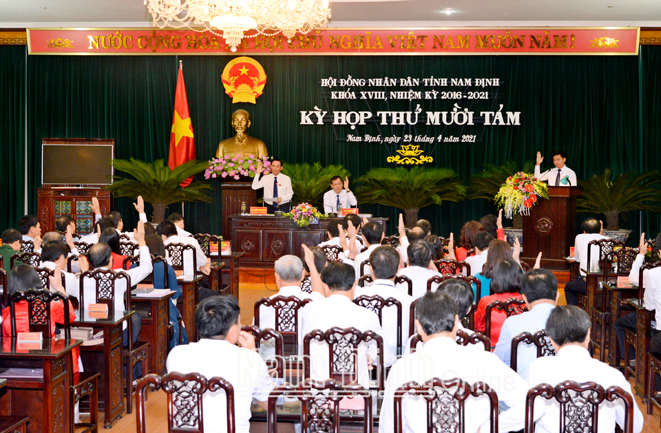 hiều 23-4, Thường trực HĐND tỉnh khoá XVIII đã tổ chức kỳ họp thứ 18 nhằm tổng kết hoạt động của HĐND tỉnh trong nhiệm kỳ 2016-2021. Các đồng chí: Lê Quốc Chỉnh, Phó Bí thư Thường trực Tỉnh uỷ, Chủ tịch HĐND tỉnh; Nguyễn Phùng Hoan, Ủy viên Ban TVTU, Phó Chủ tịch Thường trực HĐND tỉnh chủ trì kỳ họp. Dự kỳ họp có các đồng chí: Nguyễn Văn Pha, Phó Chủ nhiệm Uỷ ban Tư pháp của Quốc hội; Phạm Đình Nghị, Phó Bí thư Tỉnh uỷ, Chủ tịch UBND tỉnh; các đồng chí Thường trực HĐND, UBND tỉnh; lãnh đạo các sở, ban, ngành, đoàn thể của tỉnh, các huyện, thành phố Nam Định và các vị đại biểu HĐND tỉnh tham dự kỳ họp.