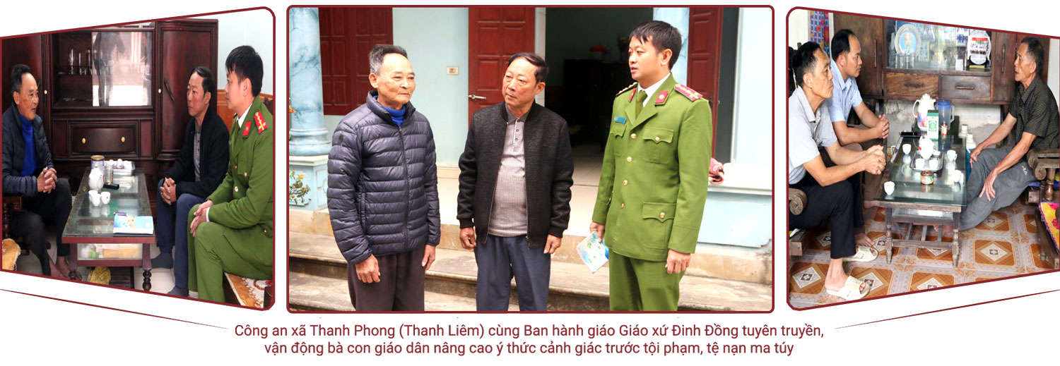 Còn ở Giáo xứ An Phú (xã Thanh Hương, huyện Thanh Liêm), nhiều năm trước, đây cũng là địa bàn có tình hình ANTT khá phức tạp do thường xuyên xảy ra tình trạng mua bán, tổ chức sử dụng trái phép chất ma túy, gây rối trật tự công cộng, gây bức xúc trong nhân dân. Đầu năm 2025, Công an xã Thanh Hương tham mưu với cấp ủy, chính quyền địa phương triển khai xây dựng mô hình “Xứ đạo không ma túy” tại Giáo xứ An Phú. Theo Trung tá Lê Hải Hà, Trưởng Công an xã Thanh Hương, sở dĩ Công an xã lựa chọn triển khai mô hình ở Giáo xứ An Phú vì nơi đây có khá đông đồng bào Công giáo sinh sống, địa bàn tương đối phức tạp về ANTT. Khi mới triển khai mô hình, địa phương cũng gặp nhiều khó khăn nhưng cùng với vai trò nòng cốt của lực lượng công an và sự tham gia tích cực của các ban, ngành, đoàn thể, các chức sắc, chức việc và nhất là bà con giáo dân, sau hơn 4 tháng thực hiện mô hình, đến nay số vụ việc liên quan đến ANTT, đặc biệt là tội phạm, TNMT tại địa bàn này giảm mạnh về số lượng và tính chất, mức độ... Đến nay, mô hình “Giáo xứ không ma túy” đã bước đầu đi vào cuộc sống nơi đây.