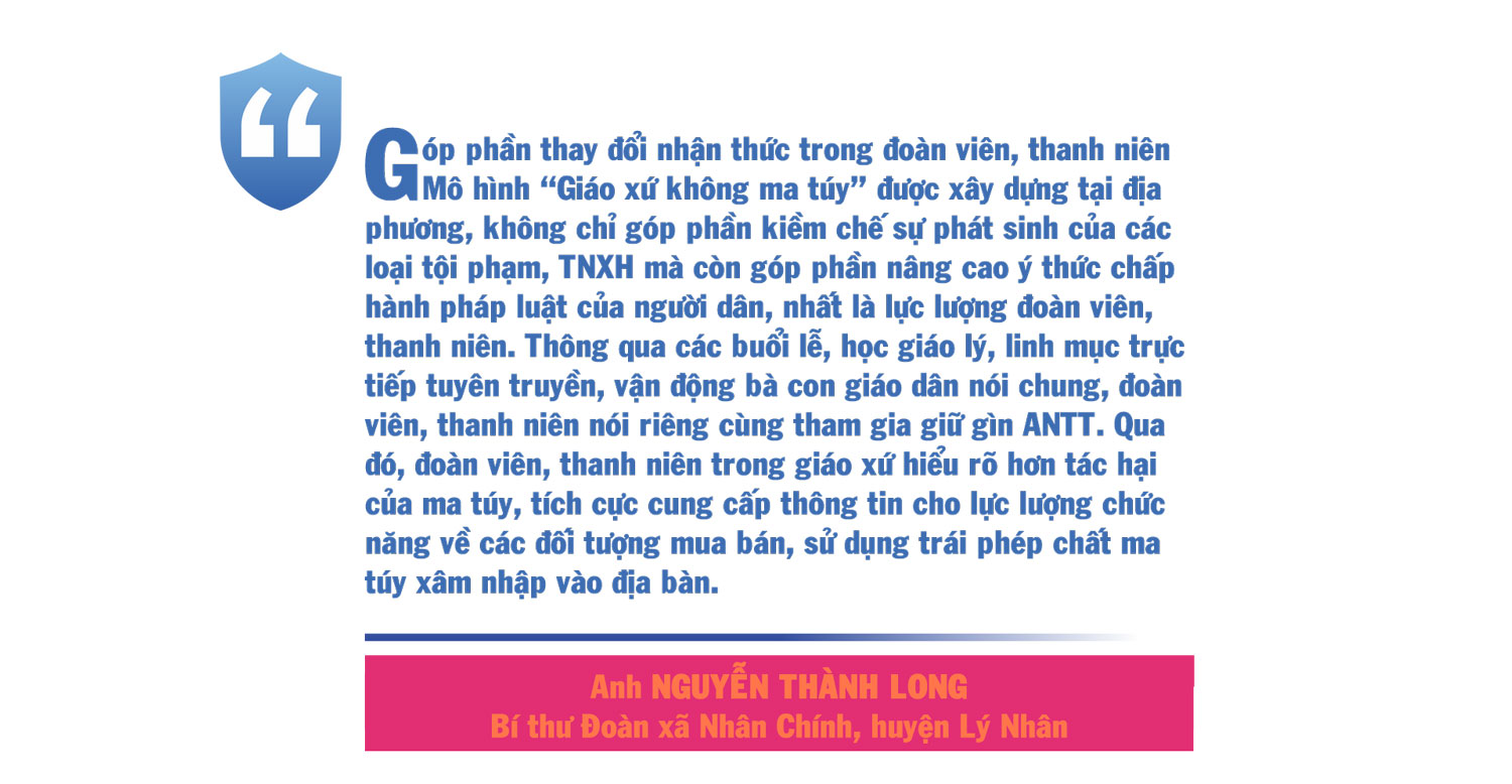 Do làm tốt công tác tuyên truyền, vận động, tại 7 giáo xứ triển khai mô hình “Giáo xứ không ma túy”, 100% hộ dân ký kết tích cực tham gia phòng, chống các loại tội phạm và TNXH, trong đó có tội phạm và TNMT; tích cực tham gia cảm hóa, giáo dục, giúp đỡ người chấp hành xong án phạt tù về ma túy, người sau cai nghiện. Bên cạnh đó, việc xây dựng mô hình “Giáo xứ không ma túy” còn được các ban, ngành, đoàn thể, giáo xứ, giáo họ gắn với các phong trào tự quản, tự bảo vệ, tự hòa giải và lồng ghép với thực hiện các phong trào thi đua yêu nước, như: “Toàn dân đoàn kết xây dựng nông thôn mới, đô thị văn minh”, “Gia đình giáo dân gương mẫu, bảo đảm ANTT”.