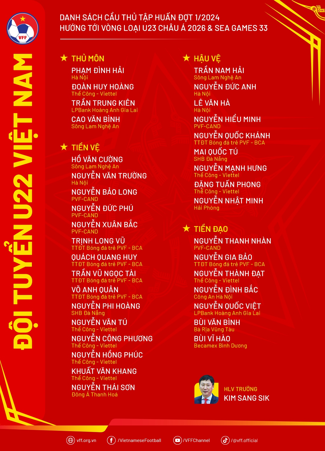 Trong số 35 cầu thủ được triệu tập, bên cạnh những cái tên quen thuộc thường xuyên khoác áo U23 Việt Nam thời gian gần đây như Khuất Văn Khang, Hồ Văn Cường, Nguyễn Văn Trường, Nguyễn Hồng Phúc, Nguyễn Thái Sơn, Nguyễn Thanh Nhàn, Nguyễn Đình Bắc, Nguyễn Quốc Việt, Bùi Vĩ Hào.