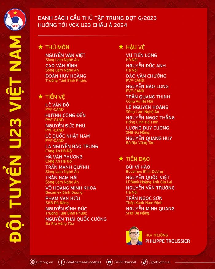 Được biết, trong quá trình tập luyện tại Trung tâm đào tạo bóng đá trẻ Việt Nam, một số gương mặt có sự thể hiện xuất sắc sẽ được trao cơ hội bổ sung vào lực lượng Đội tuyển quốc gia chuẩn bị cho vòng chung kết Asian Cup 2023.