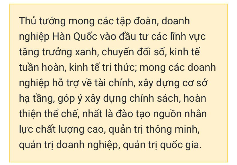 Việt Nam hoan nghênh và chào đón các nhà đầu tư Hàn Quốc. Việt Nam cũng mong các doanh nghiệp Hàn Quốc tham gia tích cực công tác an sinh xã hội, hỗ trợ xóa đói giảm nghèo, khắc phục hậu quả thiên tai lũ lụt; hỗ trợ các doanh nghiệp Việt Nam tham gia chuỗi giá trị của doanh nghiệp Hàn Quốc, chuỗi giá trị toàn cầu với tinh thần “3 cùng”: cùng lắng nghe và thấu hiểu; cùng chia sẻ tầm nhìn, nhận thức và hành động; cùng làm, cùng hưởng, cùng thắng và phát triển; lợi ích hài hoà, rủi ro chia sẻ.