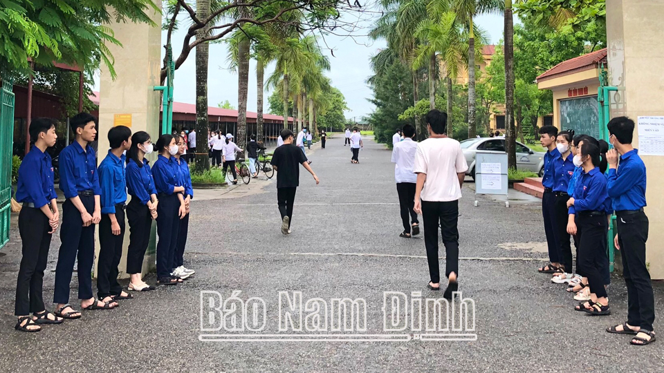 | Các tình nguyện viên Đoàn thanh niên tại điểm thi Trường THPT Nguyễn Đức Thuận (Vụ Bản) luôn túc trực tại điểm thi để hỗ trợ thí sinh. |
