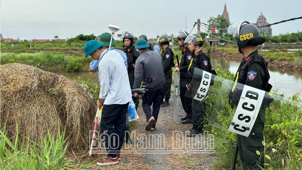 | Lực lượng Công an tỉnh thực hiện phương án đảm bảo ANTT quá trình đo đạc đất liên quan đến dự án xây dựng Nhà máy sản xuất cấu kiện bê tông đúc sẵn tại Cồn Xanh (Nghĩa Hưng) . |