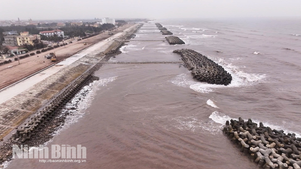 Hệ thống mỏ hàn chữ T và thềm giảm sóng tại đê biển Hải Thịnh nhìn từ trên cao.