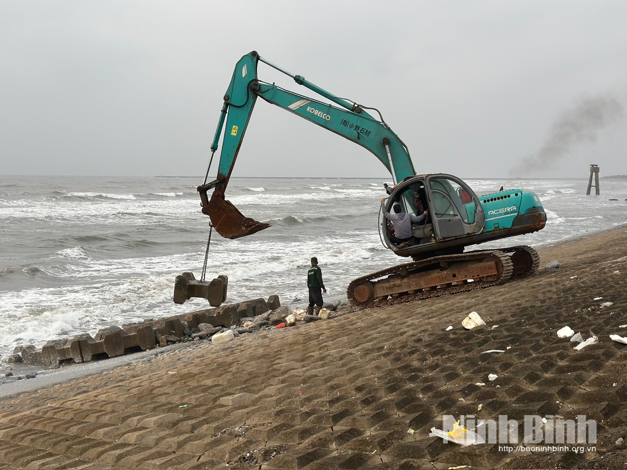 Máy xúc lắp đặt cấu kiện bê tông chuyên dụng tại tuyến đê biển Hải Thịnh.