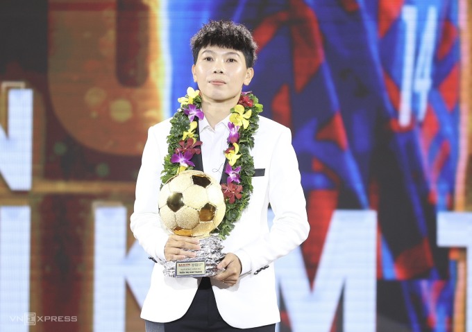 Tiền vệ Nguyễn Hoàng Đức ít cười khi lên bục nhận giải Quả Bóng Vàng Việt Nam 2023.
