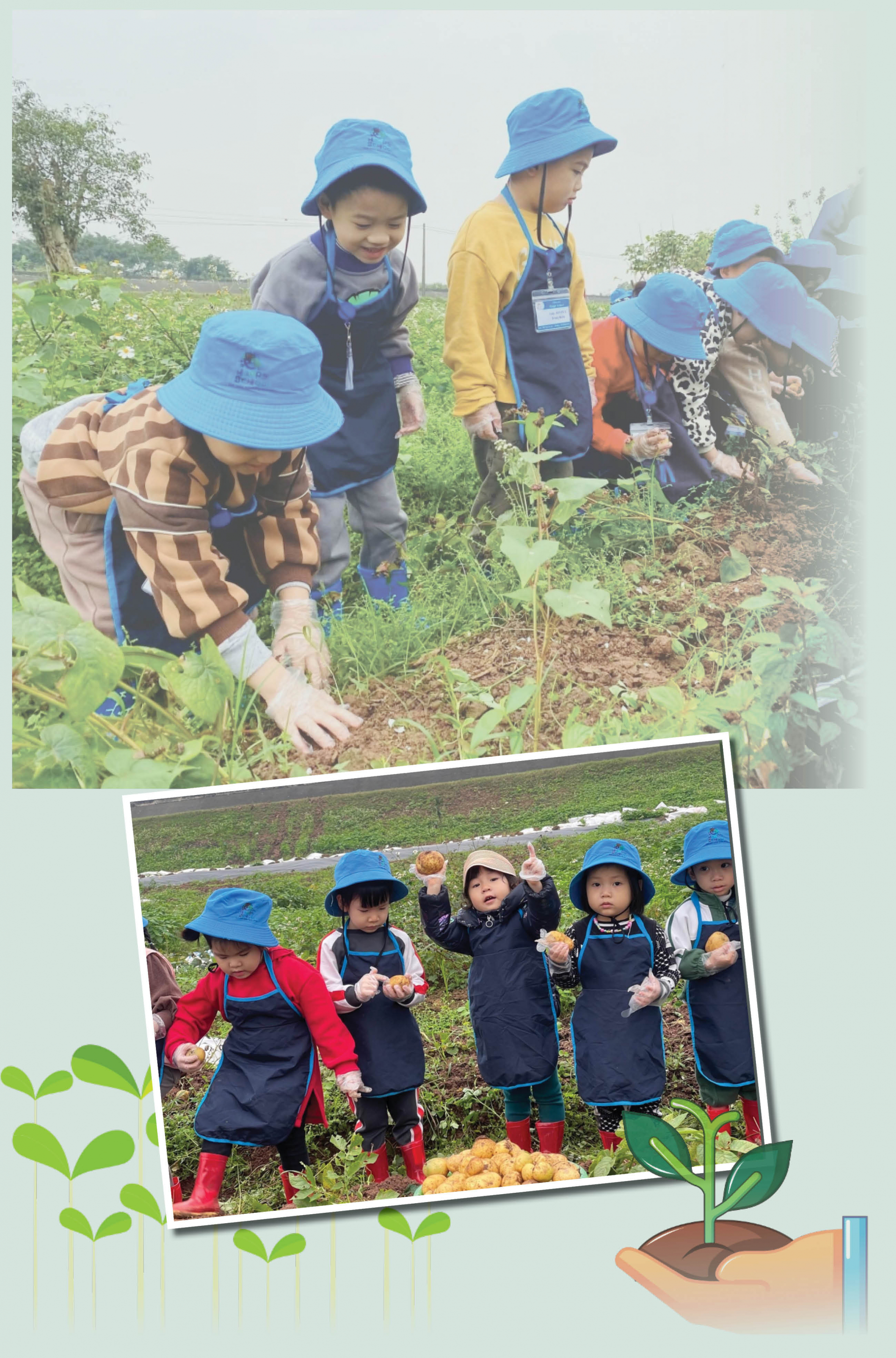 | Học sinh Trường Mầm non Happy School (thành phố Nam Định) đi trải nghiệm thực tế nhổ khoai tây. |
