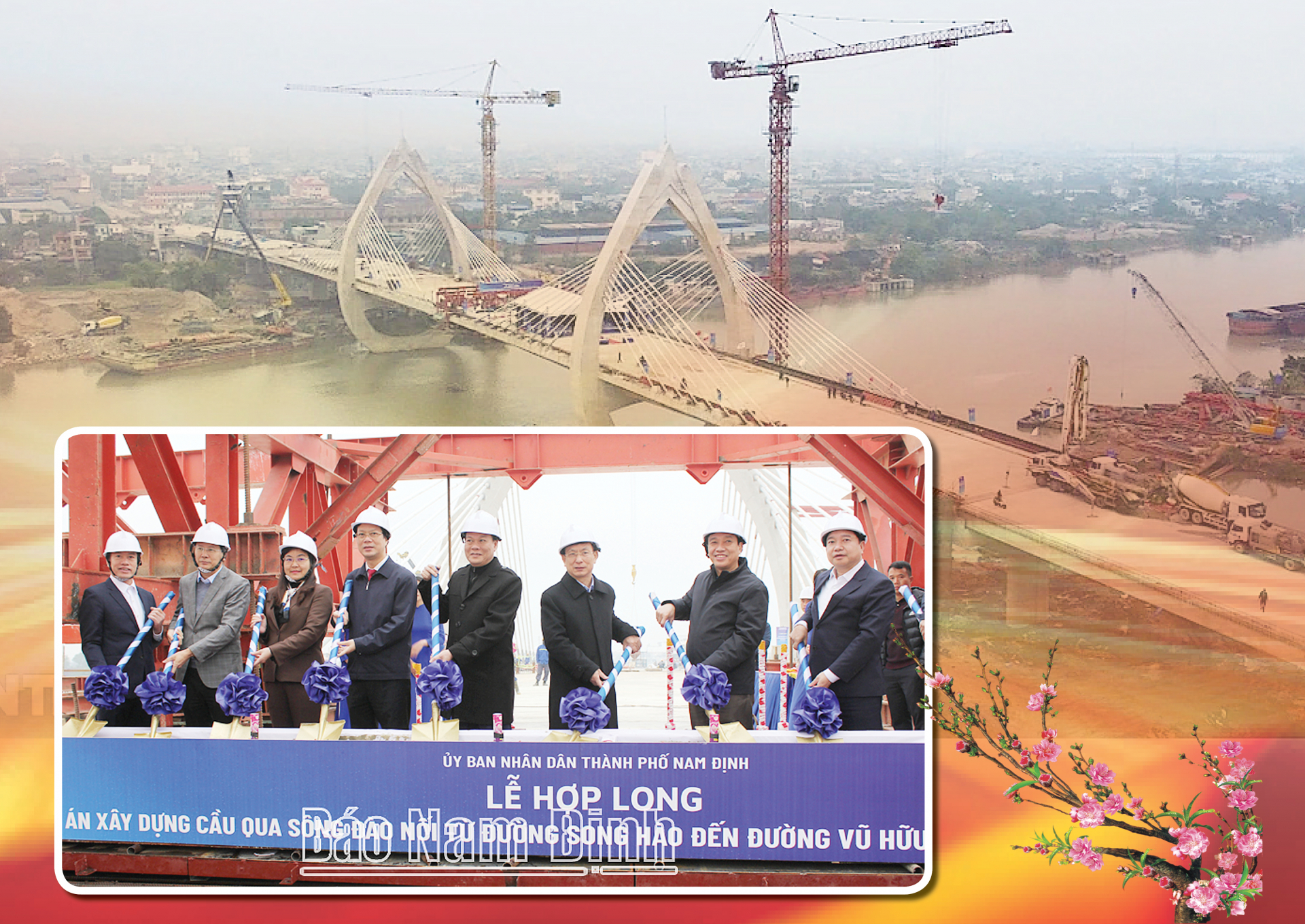 | Các đồng chí: Phó Bí thư Thường trực Tỉnh ủy Lê Quốc Chỉnh; Chủ tịch UBND tỉnh Phạm Đình Nghị; lãnh đạo UBND tỉnh cùng các sở, ngành của tỉnh và thành phố Nam Định thực hiện nghi thức hợp long cầu vượt sông Đào. (Ảnh: Thành Trung) |