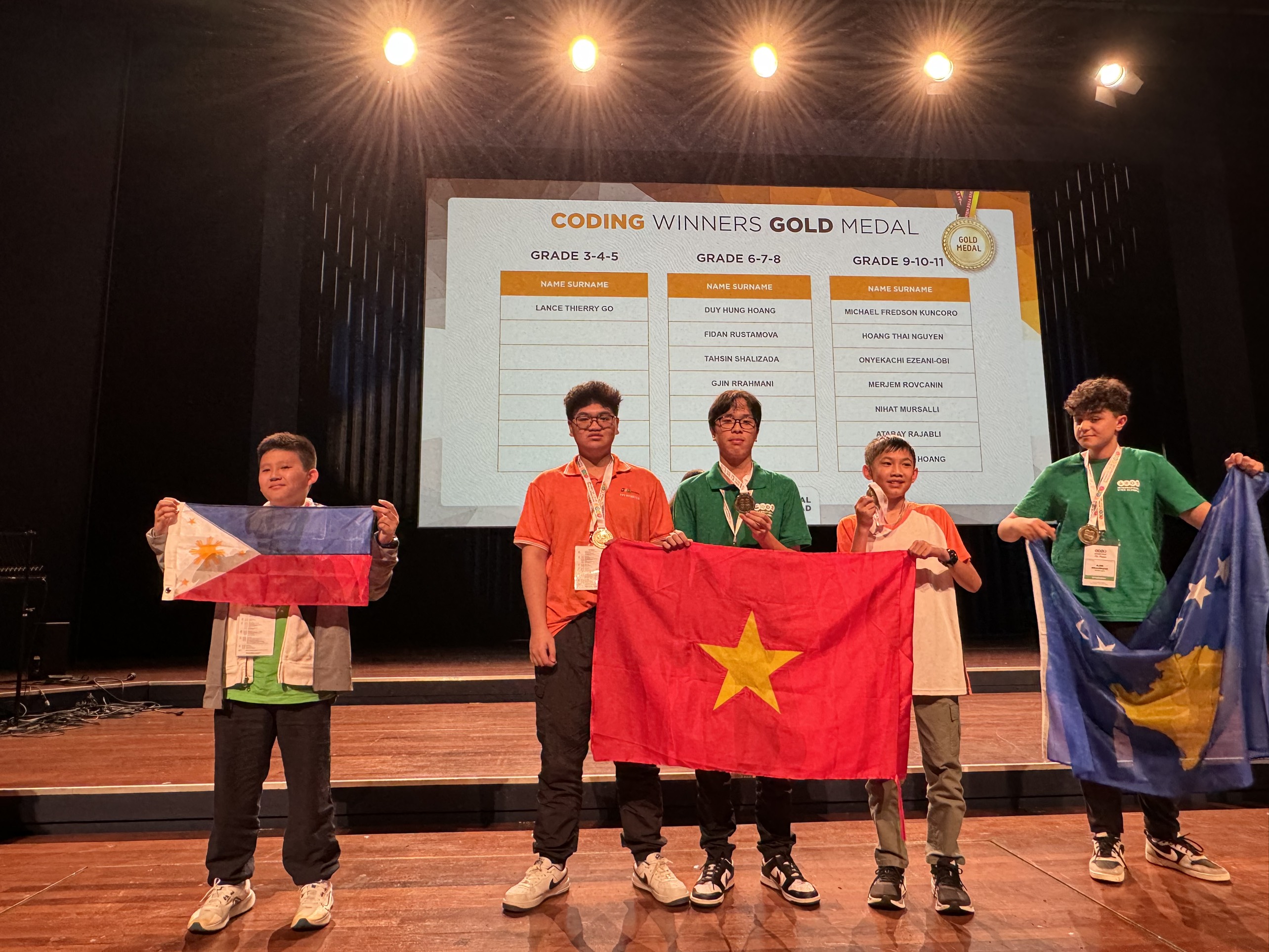 Hoàng Duy Hưng (ngoài cùng bên phải) đạt Huy chương Vàng thế giới môn Tin học khối 6-7-8.
