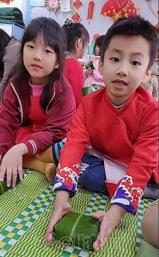 Sáng 16/1, trong tiết trời ấm áp, nhiều học sinh được hòa mình vào chương trình trải nghiệm gói bánh chưng Tết. Tại sân trường rộn rã tiếng nhạc và tiếng nói cười náo nức, học sinh trong trang phục áo dài truyền thống rất hào hứng với hoạt động gói bánh chưng. Nguyên liệu làm bánh gồm gạo nếp, lá dong, lạt…. đã được chuẩn bị từ trước. Học sinh các khối 1 đến khối 5 tích cực lắng nghe hướng dẫn của thầy cô và cha mẹ, quan sát động tác và trực tiếp tham gia vào công đoạn gói bánh. Sản phẩm là những chiếc bánh nhỏ xinh, tuy còn vụng về nhưng rất đáng yêu. Vừa gói bánh chưng các con vừa được nghe về sự tích bánh chưng bánh dày, về sự sáng tạo và lòng hiếu thảo của Lang Liêu. Các con hiểu hơn về ý nghĩa nhân văn sâu xa, thấm đượm nghĩa tình ẩn trong chiếc bánh giản dị nhỏ bé tưởng chừng rất đỗi bình thường.
