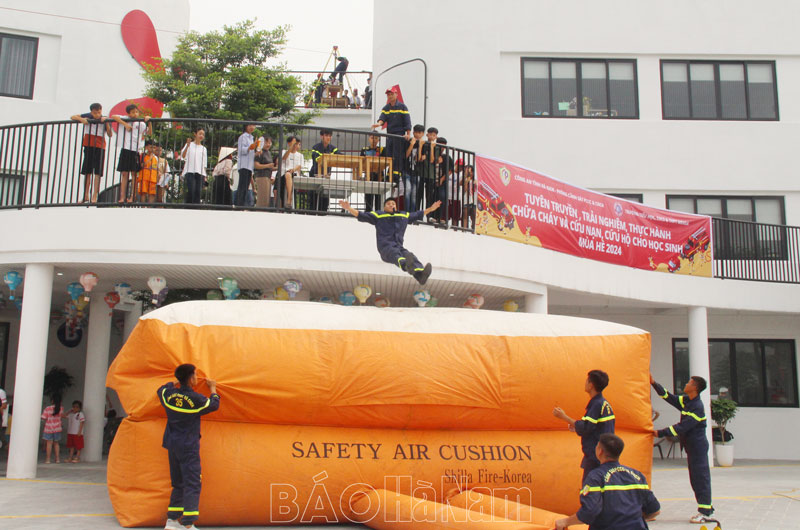 Cán bộ, chiến sỹ cảnh sát PCCC và CNCH hướng dẫn kỹ năng thoát nạn bằng cầu dây nghiêng, đệm hơi.Các em học sinh được quan sát, trải nghiệm nhiều thiết bị, phương tiện chữa cháy, CNCH chuyên dụng tại buổi trải nghiệm.