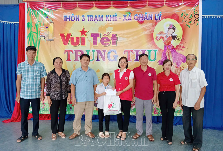 Nhân dịp Tết Trung thu năm 2024, Hội Chữ thập đỏ huyện Lý Nhân đã thăm, tặng quà, kinh phí hỗ trợ thường xuyên quý 3/2024 cho 7 em thiếu nhi có hoàn cảnh đặc biệt khó khăn tại các xã: Xuân Khê, Hòa Hậu, Nhân Thịnh, Chân Lý, Nguyên Lý, Công Lý và thị trấn Vĩnh Trụ, mỗi em 900 nghìn đồng tiền mặt và quà, tổng kinh phí 7 triệu đồng.