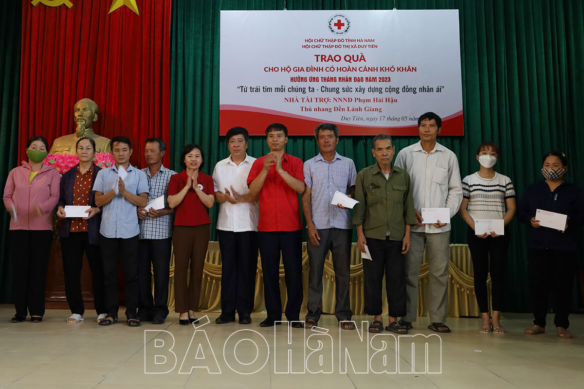 Tại chương trình, Hội Chữ thập đỏ thị xã đã trao tặng 200 suất quà cho các hộ gia đình có hoàn cảnh khó khăn trên địa bàn 4 xã Tiên Sơn, Yên Nam, Tiên Ngoại và phường Tiên Nội. Tổng giá trị chương trình là 60 triệu đồng, trong đó Nghệ nhân nhân dân Phạm Hải Hậu, Thủ nhang Đền Lảnh Giang hỗ trợ 30 triệu đồng; Hội Chữ thập đỏ tỉnh hỗ trợ 20 triệu đồng, còn lại là nguồn của Hội Chữ thập đỏ thị xã.
