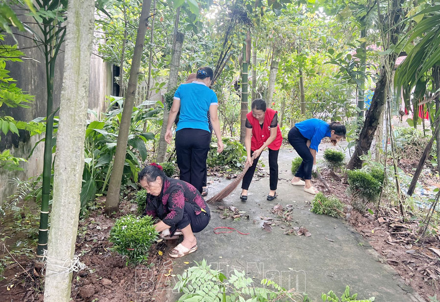 Các đại biểu cùng nhau dọn vệ sinh quanh nhà cho gia đình bà Luận.