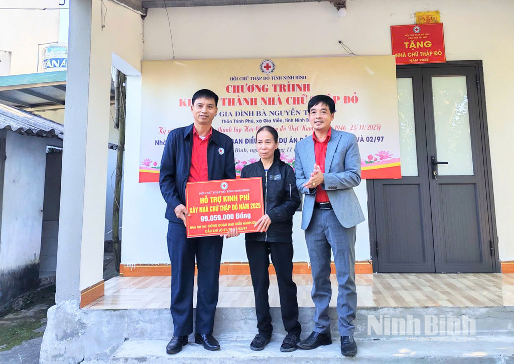 Hướng tới kỷ niệm 79 năm Ngày thành lập Hội Chữ thập đỏ Việt Nam (23/11/1946- 23/11/2025), ngày 20/11, Hội Chữ thập đỏ tỉnh Ninh Bình đã phối hợp tổ chức lễ khánh thành và bàn giao nhà “Chữ thập đỏ” cho gia đình bà Nguyễn Thị Tiếp ở thôn Trinh Phú (xã Gia Viễn) và tặng quà cho học sinh có hoàn cảnh khó khăn tại một số Trường Tiểu học trên địa bàn tỉnh.