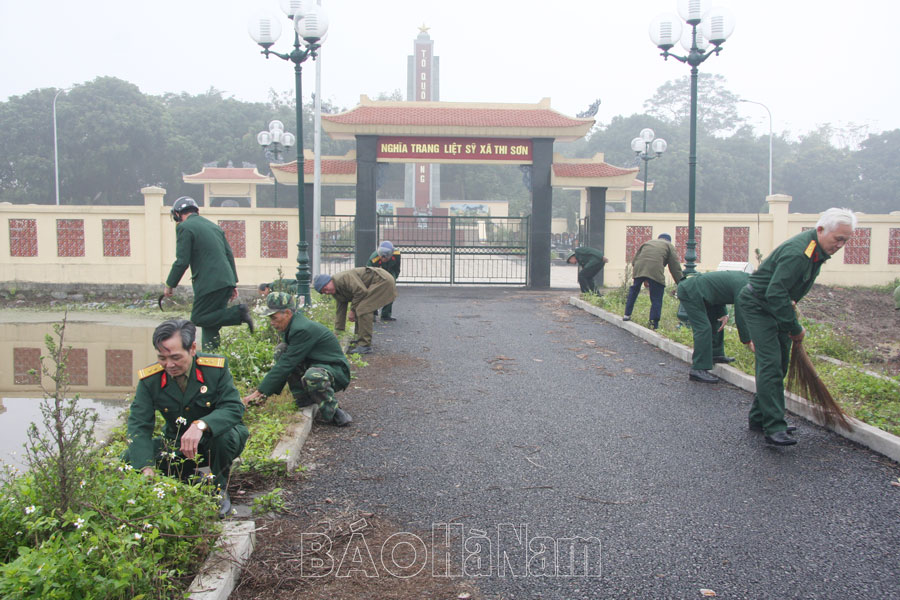 Thiết thực chào Xuân GiápThìn 2024; Đại hội thi đua “CCB gương mẫu” các cấp tiến tới Đại hội thi đua yêu nước Hội CCB Việt Nam lần VII...sáng 30/1, Hội Cựu Chiến binh (CCB) xã Thi Sơn (Kim Bảng) ra quân tổng vệ sinh, chăm sóc cây xanh khu vực nghĩa trang liệt sỹ.