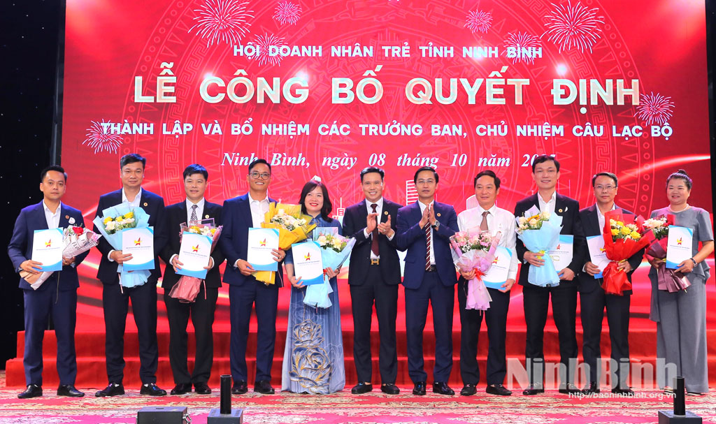 Lãnh đạo Hội Doanh nhân trẻ tỉnh Ninh Bình trao quyết định thành lập và bổ nhiệm các trưởng ban và chủ nhiệm câu lạc bộ của Hội.Lãnh đạo Hội Doanh nhân trẻ tỉnh Ninh Bình trao quyết định kết nạp hội viên mới.