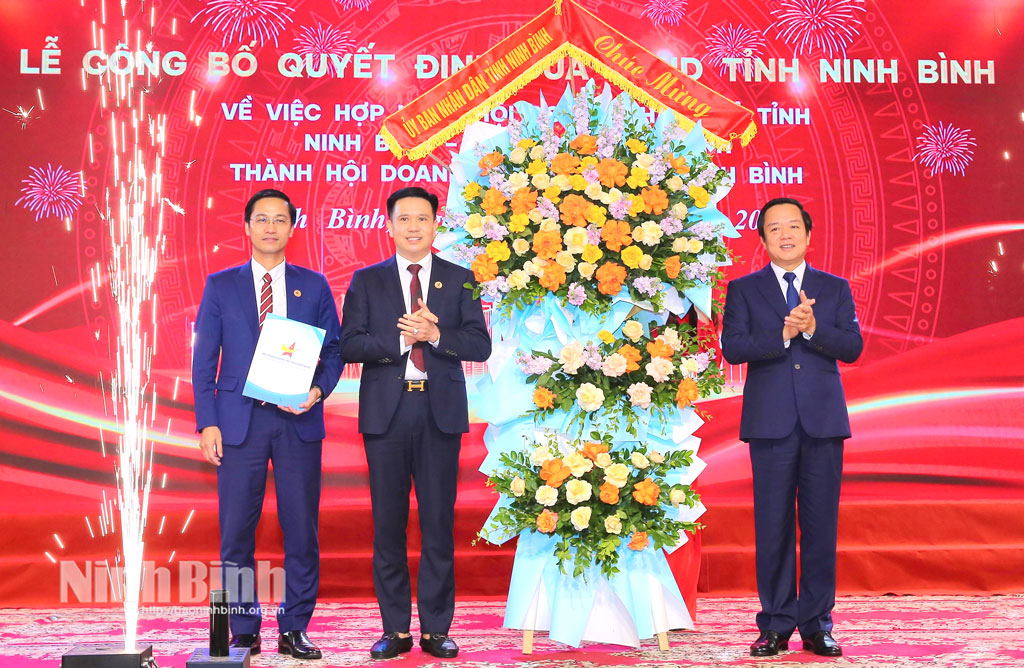 Đồng chí Phạm Quang Ngọc, Phó Bí thư Tỉnh ủy, Chủ tịch UBND tỉnh tặng hoa và trao quyết định hợp nhất Hội Doanh nhân trẻ Ninh Bình, Hà Nam và Nam Định, chính thức thành lập Hội Doanh nhân trẻ tỉnh Ninh Bình.