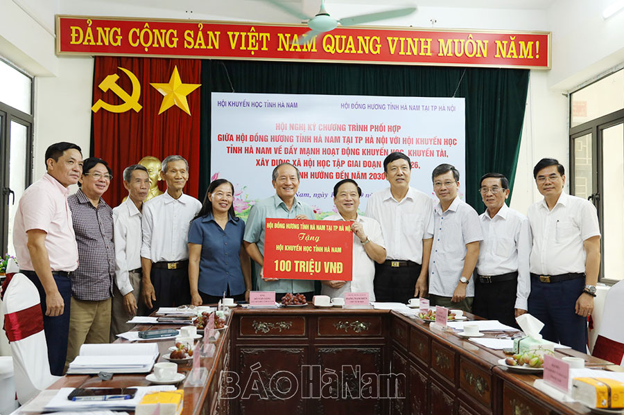 Hội đồng hương tỉnh Hà Nam tại thành phố Hà Nội tặng Hội Khuyến học tỉnh 100 triệu đồng.
