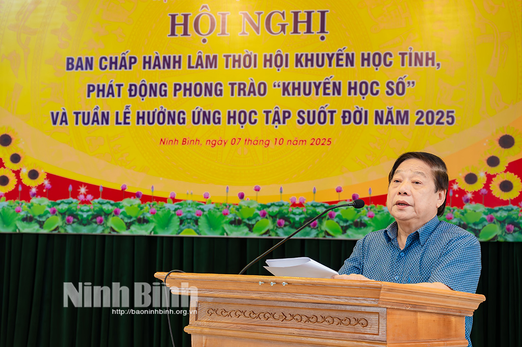 Ngày 7/10, Hội Khuyến học tỉnh Ninh Bình đã tổ chức Hội nghị Ban Chấp hành lâm thời và lễ phát động phong trào “Khuyến học số”, Tuần lễ hưởng ứng học tập suốt đời năm 2025. Tham gia lễ phát động, có lãnh đạo Hội Khuyến học Việt Nam; Ủy ban MTTQ Việt Nam tỉnh Ninh Bình.