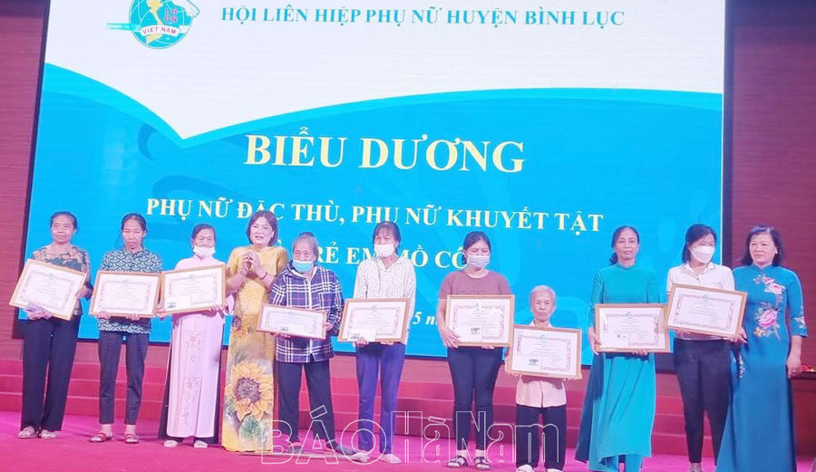 Thời gian qua, Hội Liên hiệp Phụ nữ (LHPN) huyện Bình Lục đã có nhiều việc làm thiết thực giúp phụ nữ khuyết tật tiếp cận với kiến thức pháp luật, phòng chống bạo lực, xây dựng gia đình hạnh phúc, hỗ trợ học nghề, tạo việc làm, thăm hỏi, tặng quà động viên chị em khắc phục khó khăn, tặng quà học bổng cho trẻ em mồ côi. Qua đó, từng bước giúp hội viên phụ nữ khuyết tật, trẻ em mồ côi khắc phục khó khăn, vượt qua mặc cảm tạo dựng cuộc sống ổn định, xây dựng gia đình hạnh phúc.