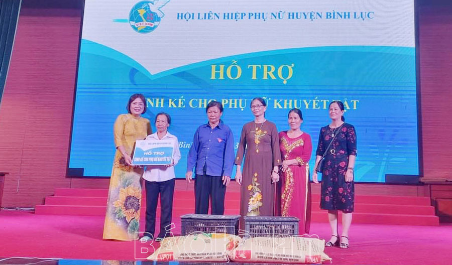 Để hỗ trợ, giúp phụ nữ khuyết tật có việc làm, tạo thu nhập một cách độc lập bảo đảm cuộc sống của bản thân và gia đình, Hội LHPN huyện đã hỗ trợ mô hình sinh kế, tặng 680 con gà giống (gà móng Tiên Phong), hỗ trợ thức ăn chăn nuôi, hướng dẫn kỹ thuật chăm sóc, phòng trừ dịch bệnh trên đàn gà cho 17 phụ nữ khuyết tật; phối hợp với sư thầy Thích Đàm Thủy, trụ trì chùa Châu Xá, phường Lê Hồng Phong, thành phố Phủ Lý trao 2 mô hình sinh kế cho phụ nữ khuyết tật tại xã Tràng An và xã Bối Cầu; phối hợp với Công ty cổ phần Phát triển nông nghiệp công nghệ cao nấm vàng tại thành phố Hồ Chí Minh tổ chức trao 374 suất quà cho phụ nữ khuyết tật và các bệnh nhân mắc bệnh hiểm nghèo.