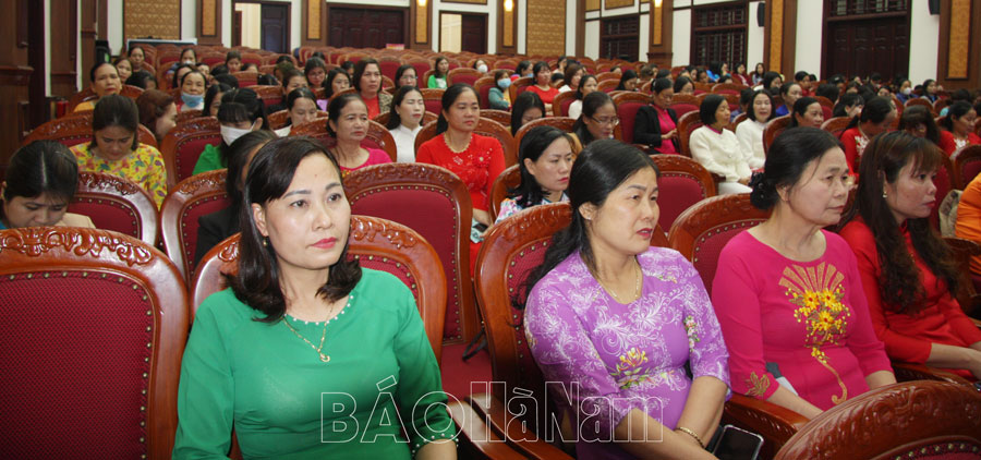 Cán bộ, hội viên Hội LHPN huyện Kim Bảng nghe nói chuyện chuyên đề Phụ nữ hiện đại 3T (tâm linh, tâm lý, tâm tình) do Hội LHPN huyện tổ chức.