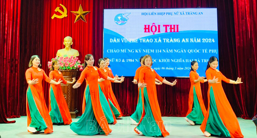 Một tiết mục dân vũ thể thao do CLB dân vũ Hội LHPN xã Tràng An (Bình Lục) tổ chức nhân kỷ niệm 114 năm ngày Quốc tế Phụ nữ.
