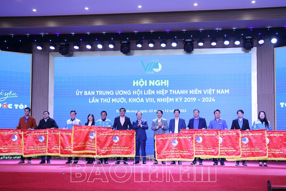 Bí thư Thường trực Trung ương Đoàn, Chủ tịch Hội LHTN Việt Nam Nguyễn Ngọc Lương tặng Cờ “Đơn vị dẫn đầu thi đua trong công tác Hội và phong trào thanh niên năm 2023” cho các đơn vị tiêu biểu cả nước.