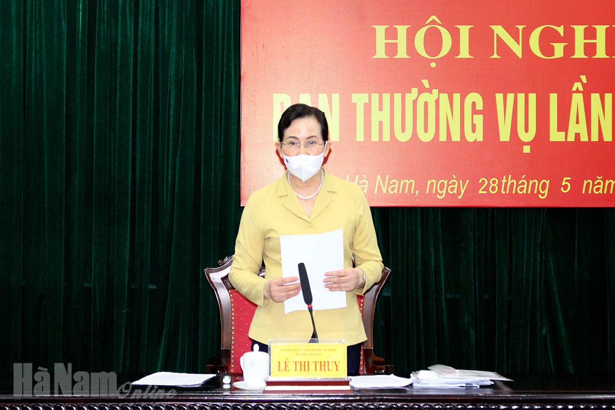 Kết luận nội dung này, đồng chí Bí thư Tỉnh ủy Lê Thị Thủy đề nghị BCS Đảng UBND tỉnh chỉ đạo UBND tỉnh xác định rõ trách nhiệm trong quản lý, khai thác tài nguyên, khoáng sản của cấp tỉnh, cấp huyện và cấp xã và các sở, ngành. Đồng thời siết chặt hơn nữa việc trích đo, cắm mốc, bàn giao cụ thể, vận chuyển, nổ mìn, xay đá...; tăng cường thanh, kiểm tra, chấn chỉnh, xử lý nghiêm theo quy định của pháp luật đối với DN khai thác khoáng sản không đúng quy định, không đảm bảo các yêu cầu về BVMT; tăng cường công tác tuyên truyền để người dân giám sát, DN biết và thực hiện. Thực hiện nghiêm quy chế phát ngôn, đảm bảo việc phát ngôn phải thống nhất về nội dung, theo đúng thẩm quyền; khẩn trương chỉ đạo lập quy hoạch khu vực bảo tồn Vọoc mông trắng theo nội dung kết luận của BTV Tỉnh ủy về định hướng quy hoạch chung đô thị Kim Bảng; chỉ đạo khẩn trương tham mưu, xử lý việc đóng các mỏ tại các khu vực theo quy định và kết luận của BTV Tỉnh ủy. Đối với BTV Huyện ủy Kim Bảng, Thanh Liêm, đồng chí Bí thư Tỉnh ủy đề nghị tăng cường lãnh đạo, chỉ đạo công tác quản lý nhà nước về hoạt động khai thác khoáng sản, BVMT theo thẩm quyền, tăng cường kiểm tra xử lý nghiêm các trường hợp vi phạm theo đúng quy định của pháp luật. Những vụ việc vượt thẩm quyền khẩn trương báo cáo ngay để xử lý kịp thời.