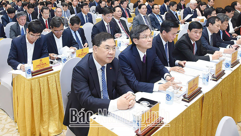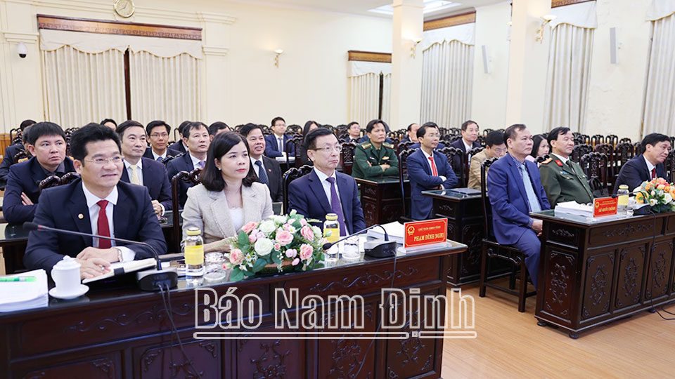 Các đồng chí: Lê Quốc Chỉnh, Phó Bí thư Thường trực Tỉnh ủy, Chủ tịch HĐND tỉnh, Trưởng đoàn Đoàn đại biểu Quốc hội tỉnh; Phạm Đình Nghị, Phó Bí thư Tỉnh ủy, Chủ tịch UBND tỉnh dự hội nghị ở điểm cầu Nam Định.